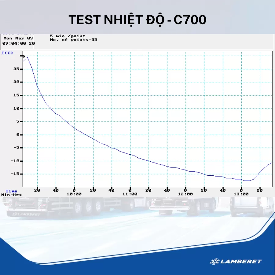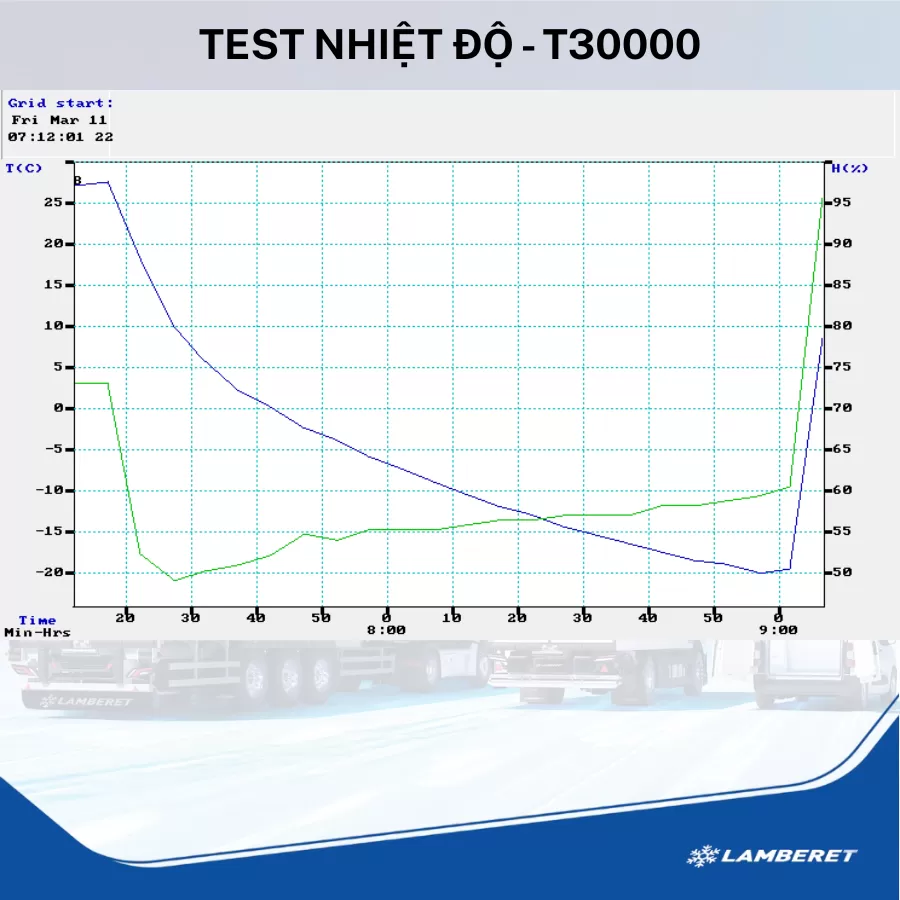 Trước khi bàn giao, 100% thùng xe tại Lamberet đều được test nhiệt độ thực tế tại xưởng. Quy trình mô phỏng vận hành ngoài thị trường, trong điều kiện đóng kín thùng, kích hoạt máy lạnh từ nhiệt độ môi trường (25–30°C), và theo dõi quá trình làm lạnh bằng thiết bị đo nhiệt chuyên dụng.